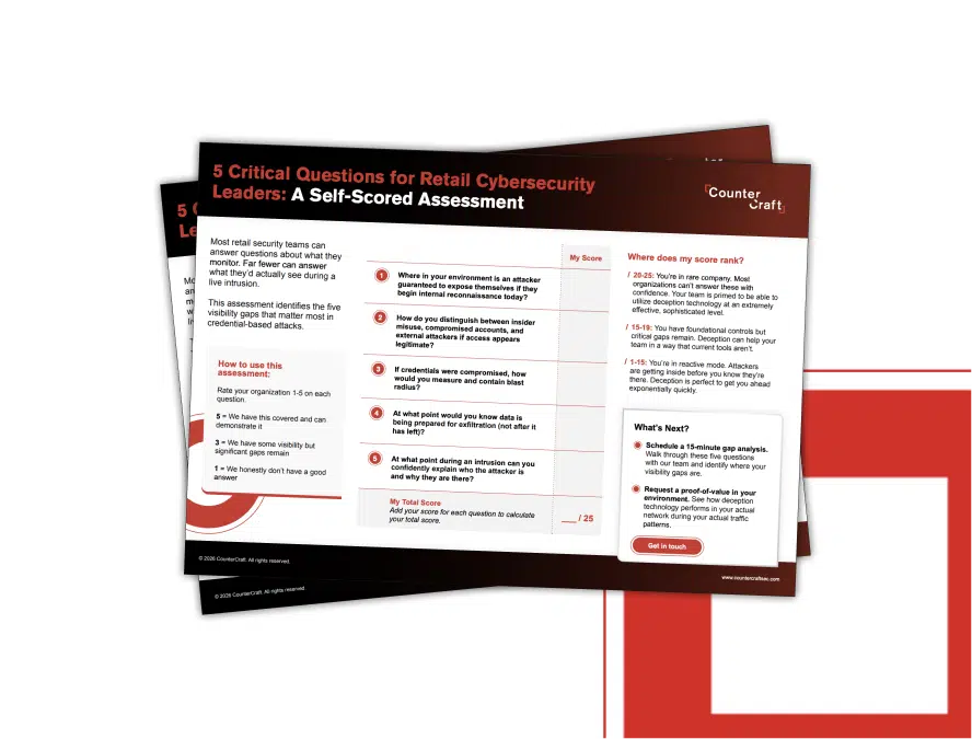 Fill out this form to receive your retail assessment sheet. Figure out where you rank with our scoring guide and get concrete insights into your visibility gaps that will help you and your organization detect, deter, document, and defend against cyber attacks.