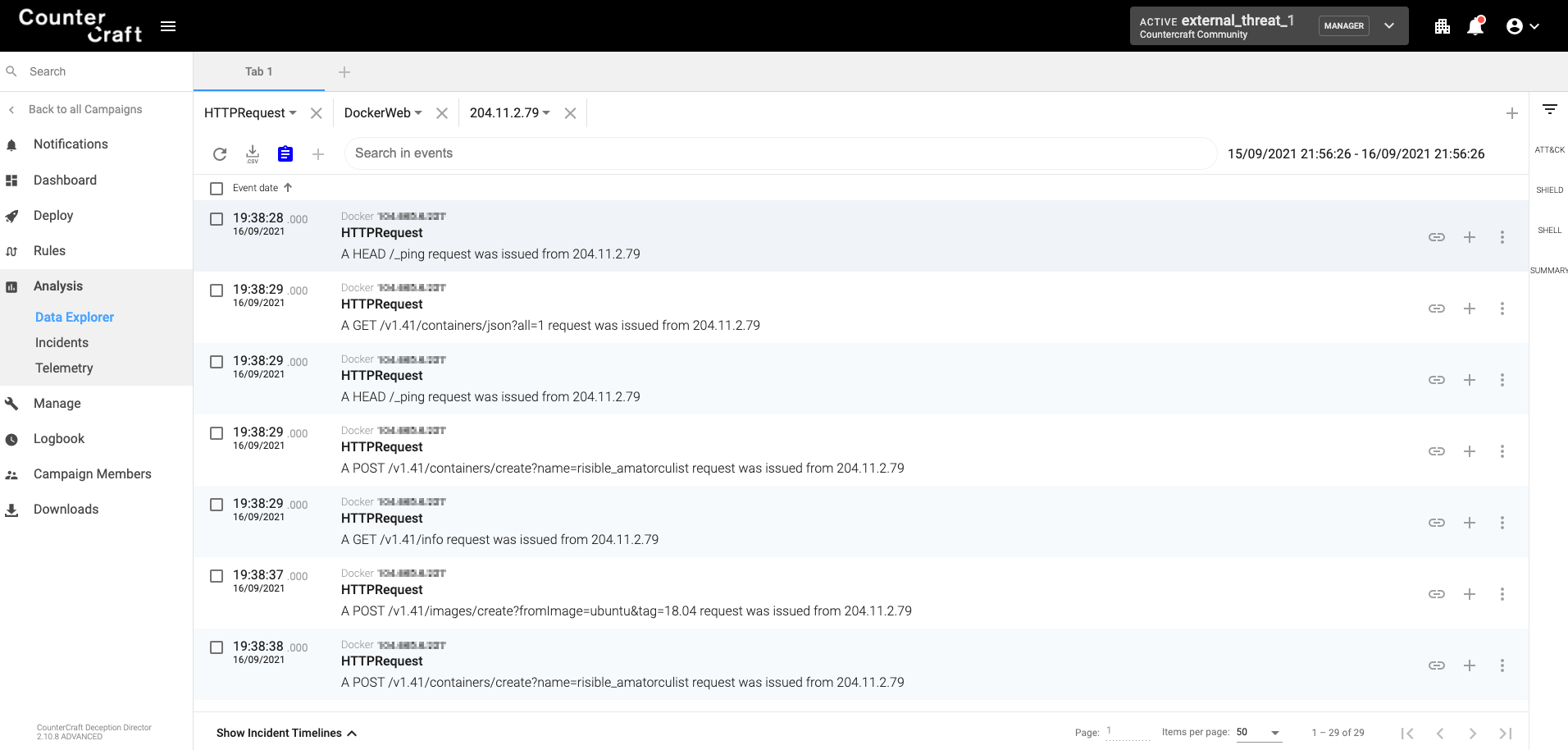 We can easily see in the next series of events how the worm found our open Docker daemon and created the malicious container: