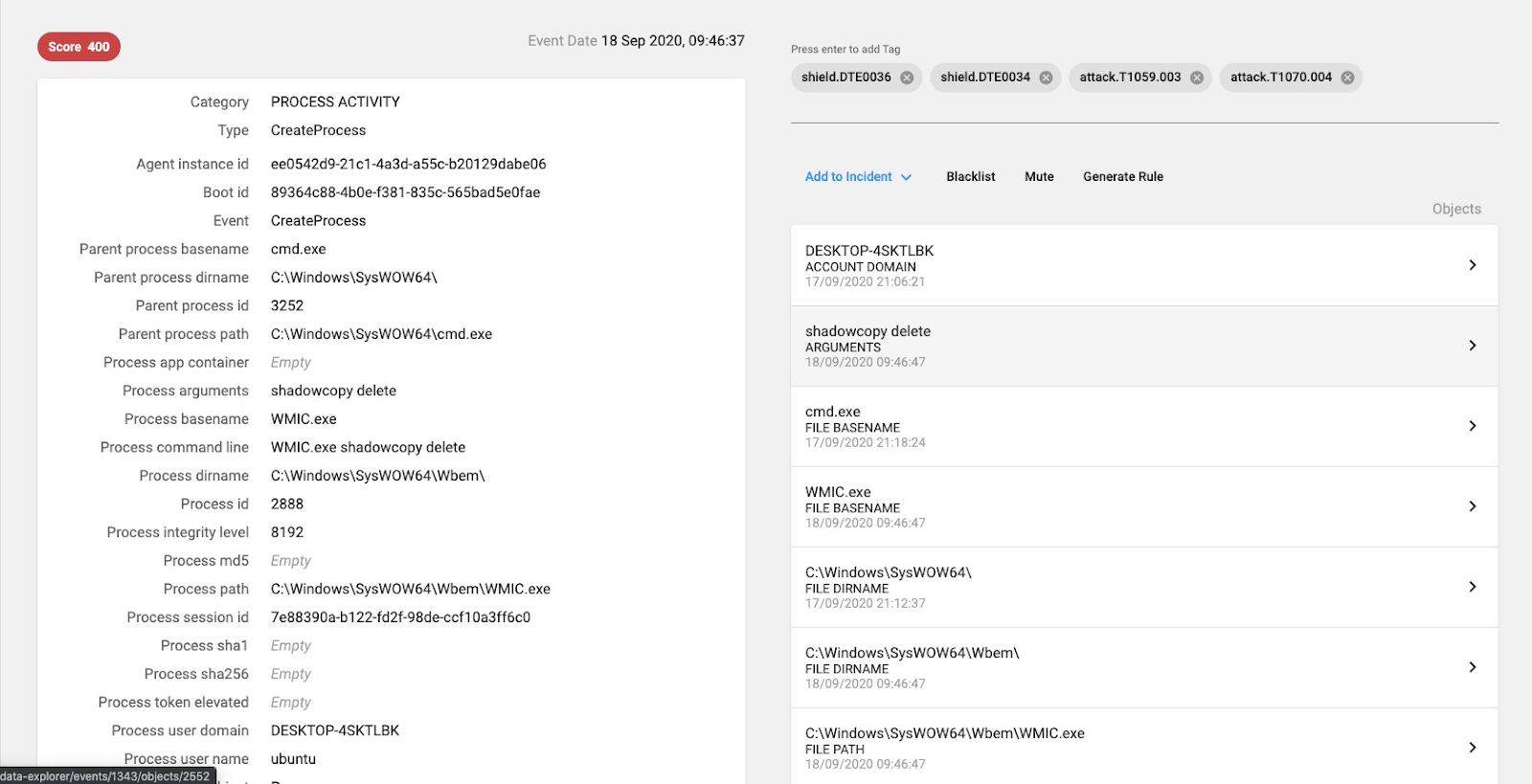 Attempts to delete Shadow copies is detected and mapped to ATT&CK techniques T1059.003 – Windows Command Shell – and T1070.004 – File Deletion